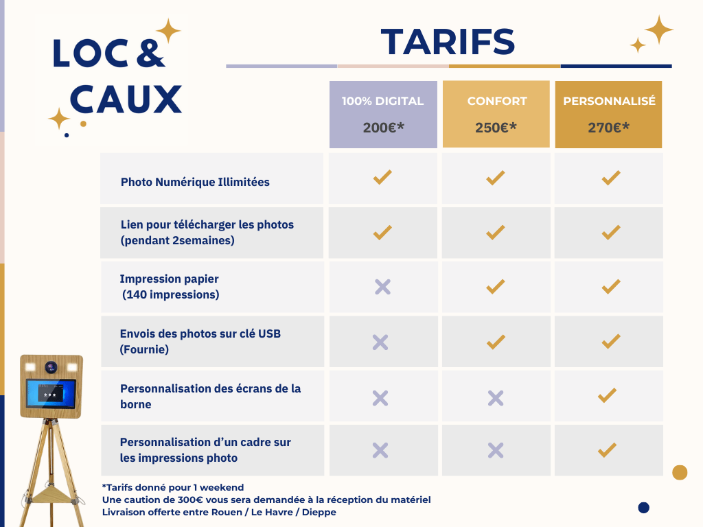Basée en Normandie, notre entreprise met un point d’honneur à offrir un service personnalisé et réactif. Avec Loc & Caux, vous profitez d’un photobooth élégant, fiable et adapté à tous vos événements.